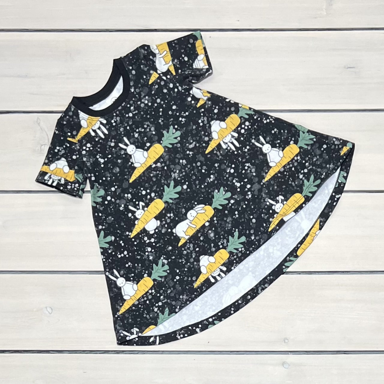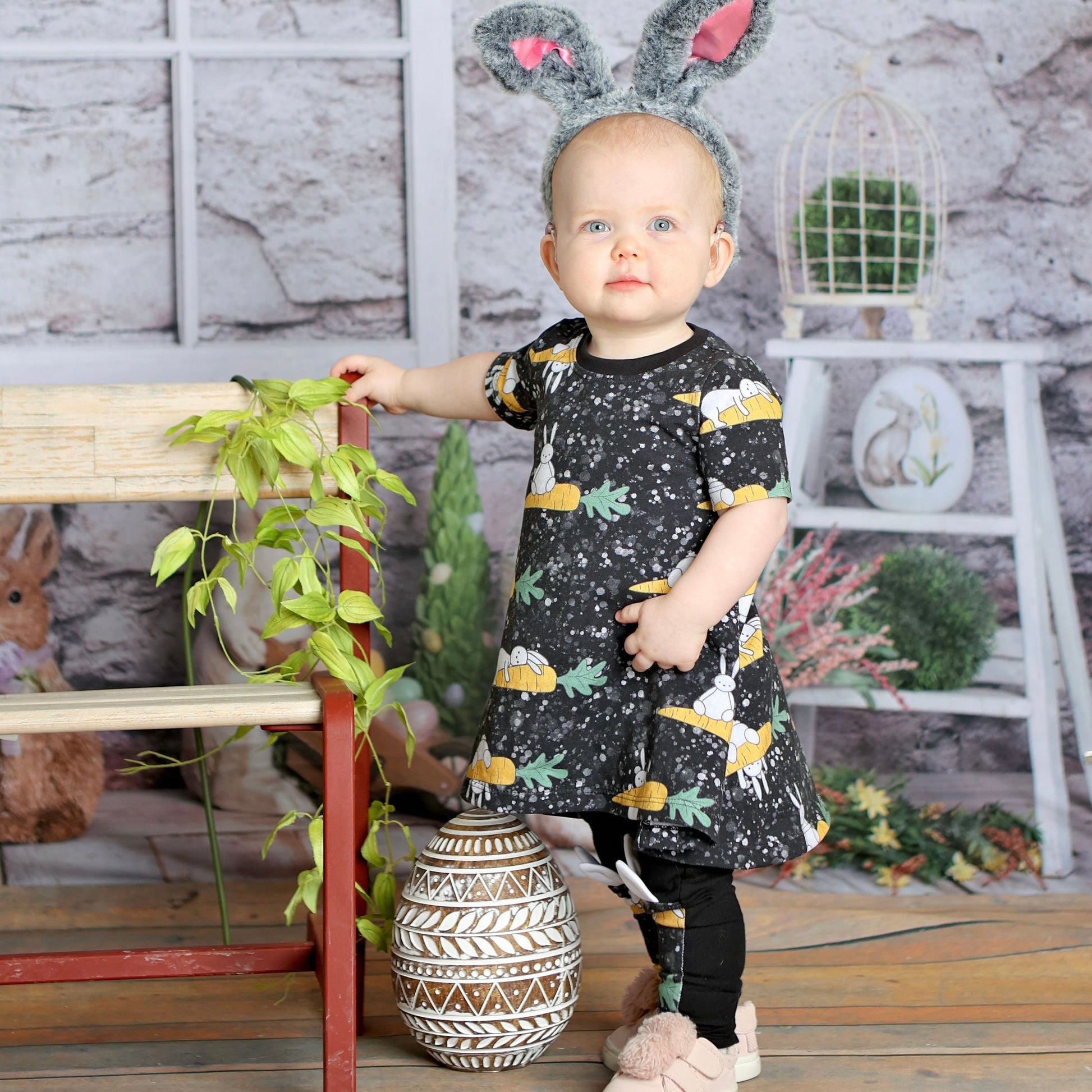 Model wears RTW 18mo and is wearing CARROT KICKPLATE LEGGINGS in size 18mo, and CARROT TSHIRT DRESS in size 12mo.