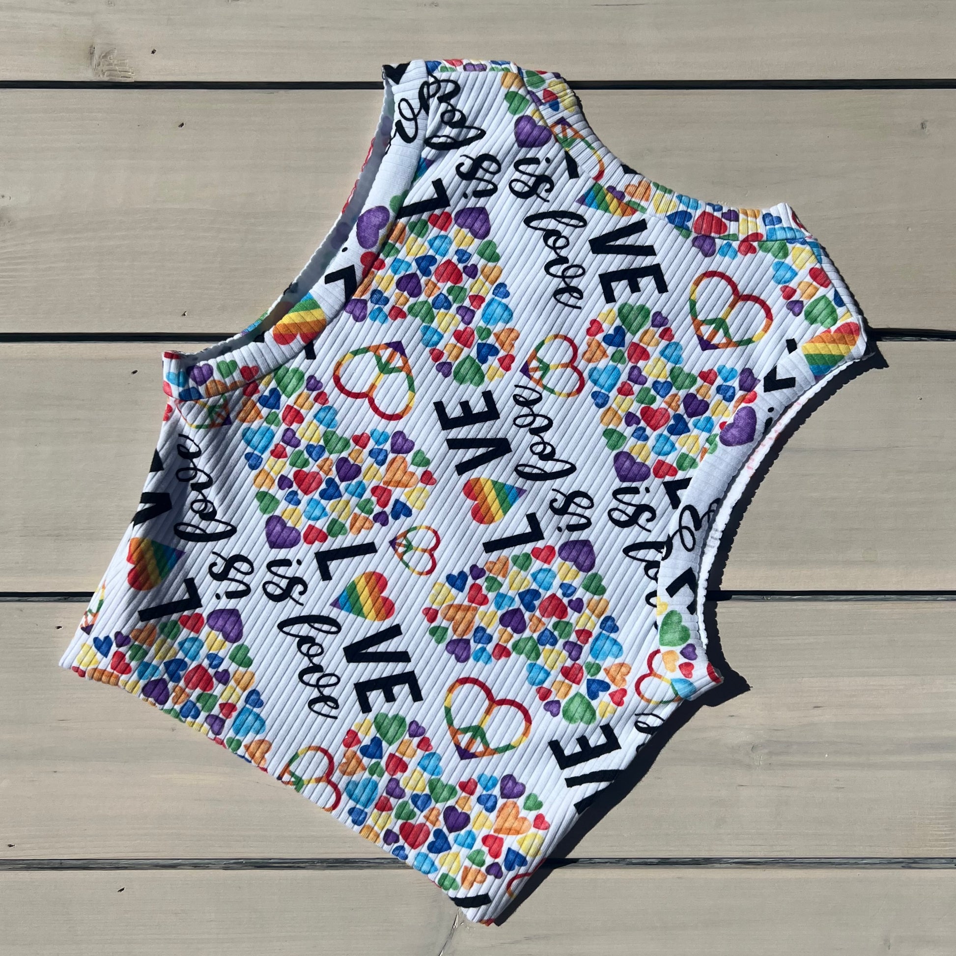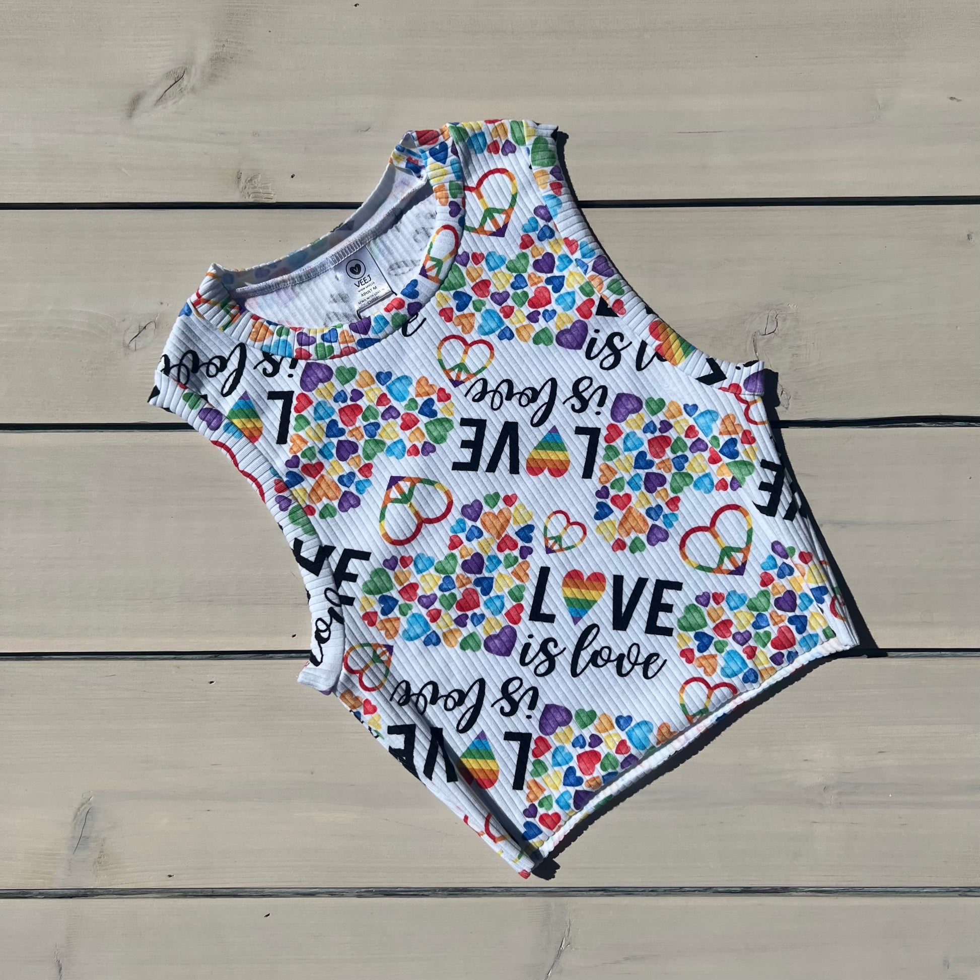 Our first adult clothing style has arrived just in time for summer. Show your love and support with our LOVE IS LOVE print. Show off that side boob or sexy bra this summer.
