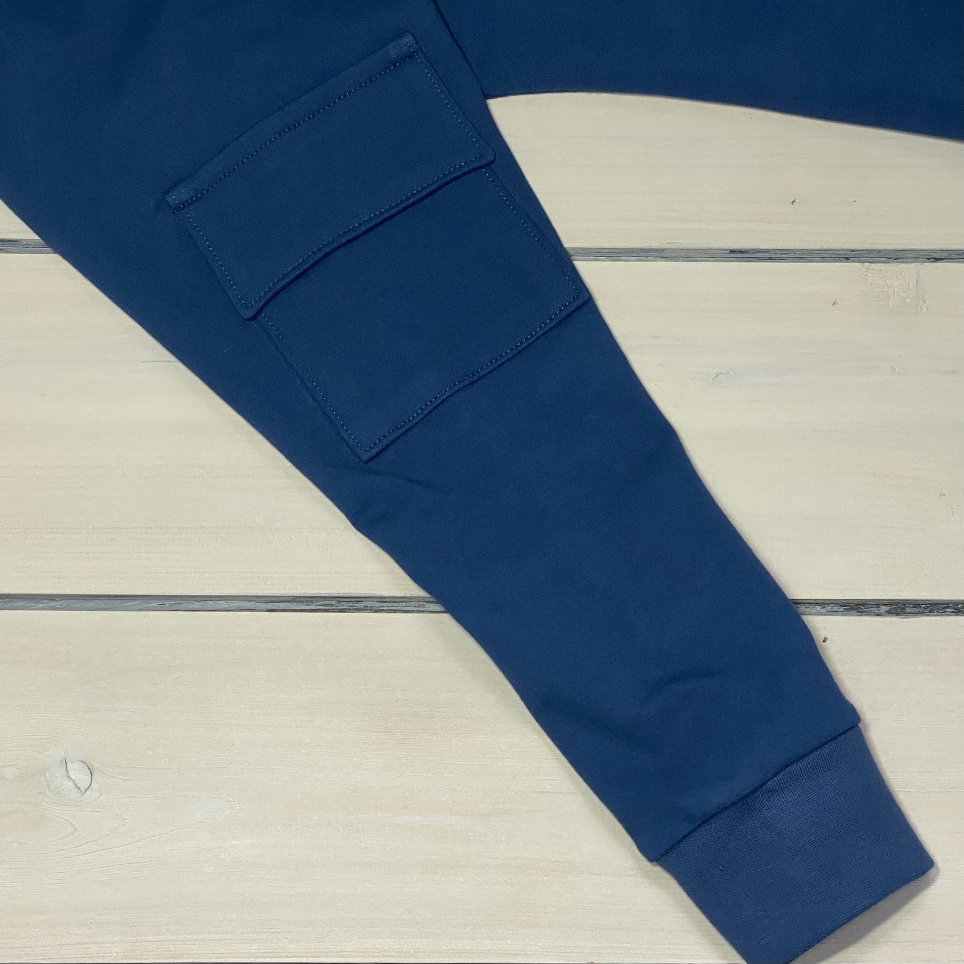 Features two side utility pockets, wide no roll elastic waistband, and cuffed ankles.